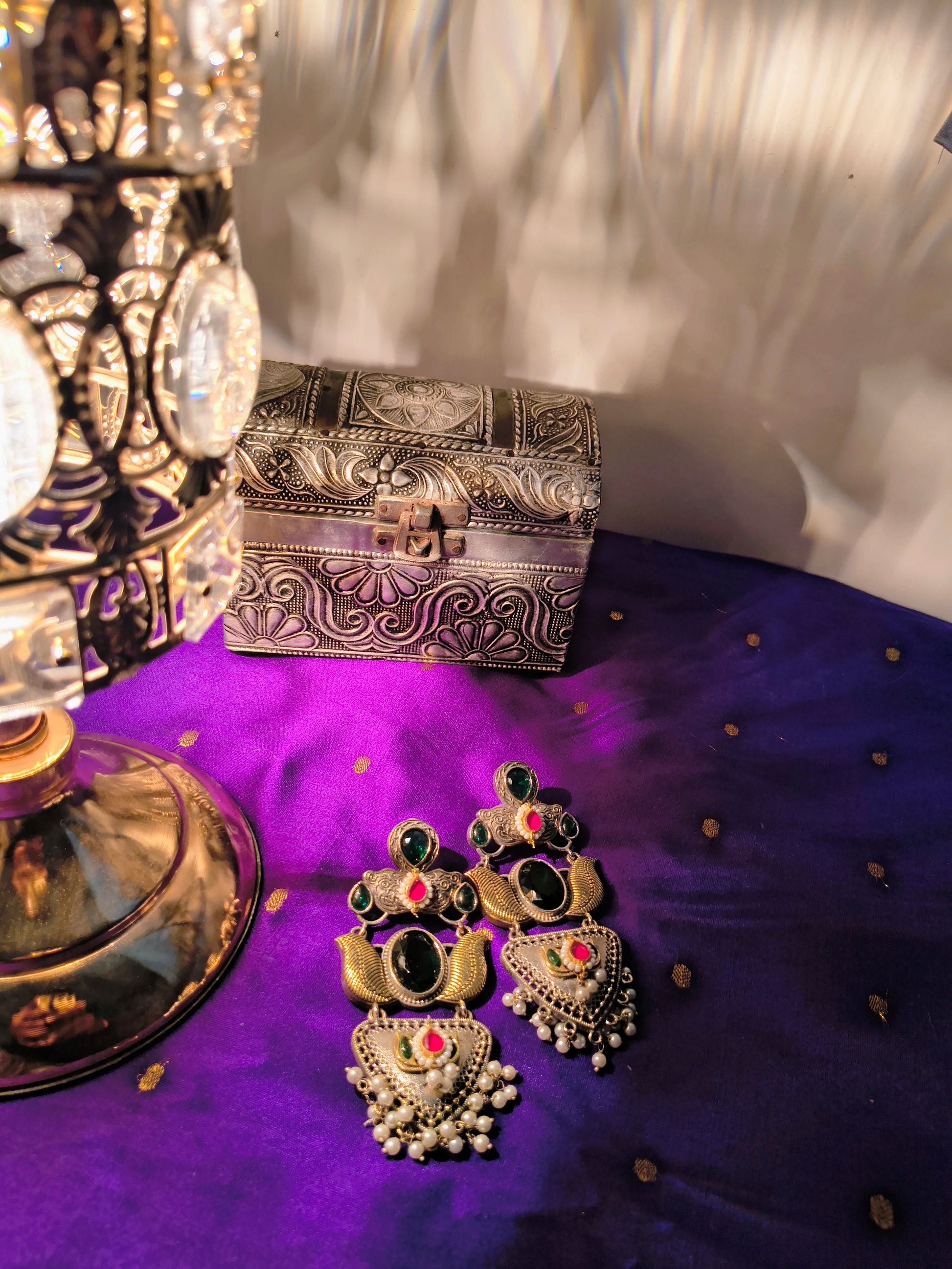 Crafted from oxidized German silver with a matte gold overlay, each pair features grand oval-cut colored stones at the center, flanked by embossed peacock-feather shapes, topped with paisley and teardrop-shaped kundan-style gems, and finished with a textured triangular pendant adorned with faux pearls and miniature beads. Their powerful silhouette and temple-inspired artistry make them a show-stopping choice for weddings, classical events, and ethnic celebrations.