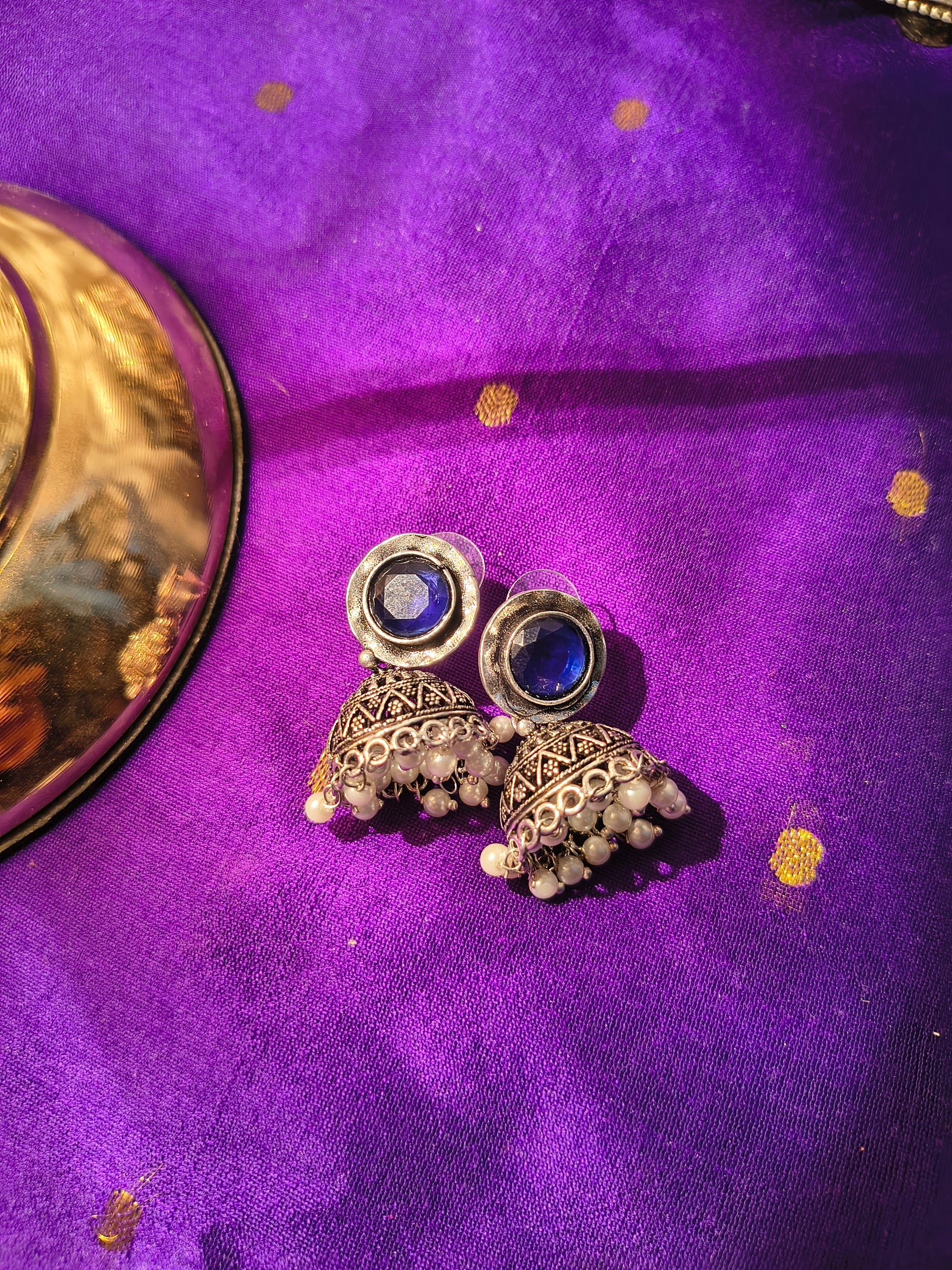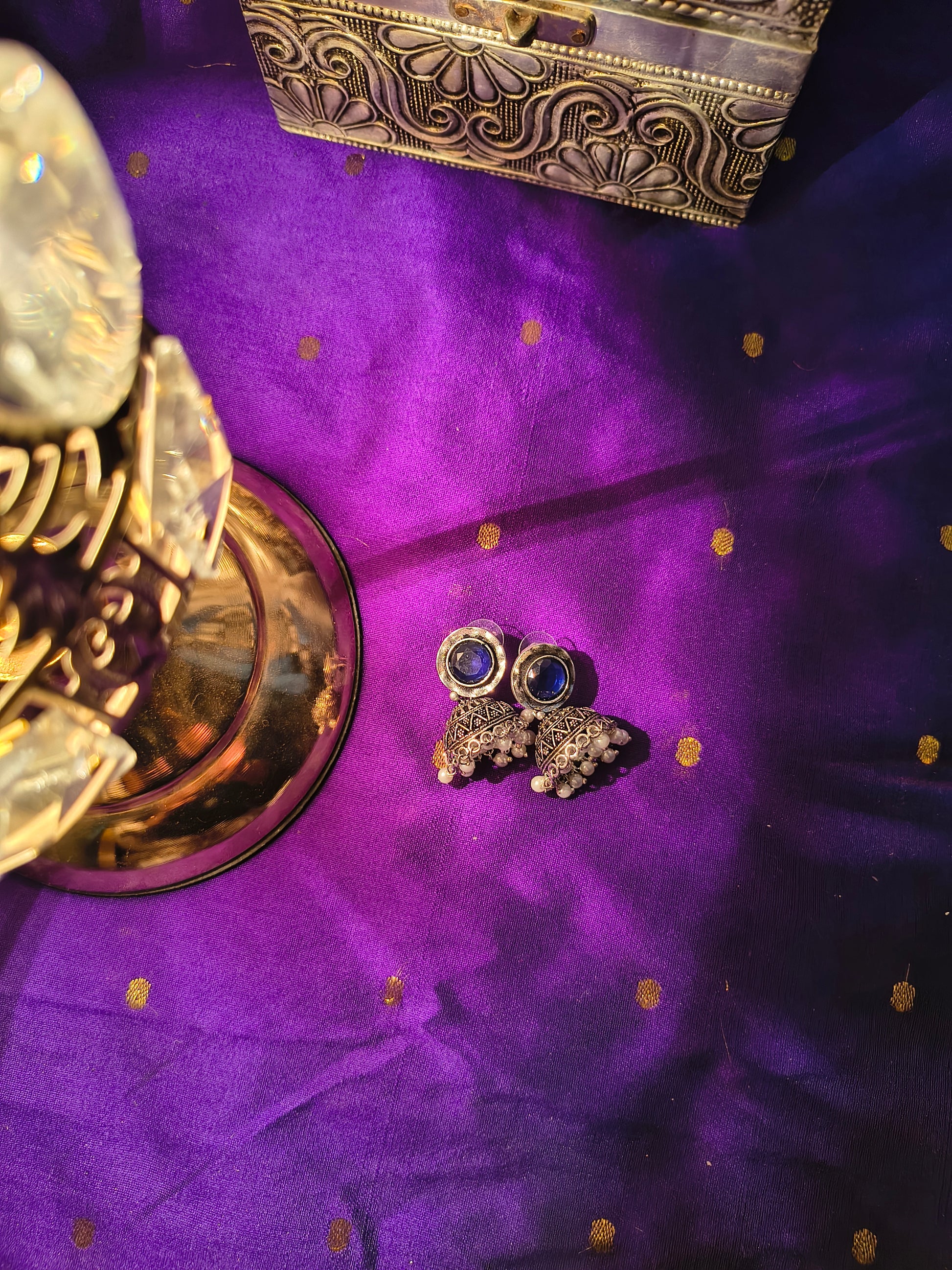 Elevate your ethnic elegance with our Vintage Blossom German Silver Stud Jhumkas, a beautifully curated pair available in Rani Pink and Royal Blue stone variants. These earrings seamlessly blend heritage craftsmanship with timeless design, ideal for traditional outfits or contemporary fusion wear.