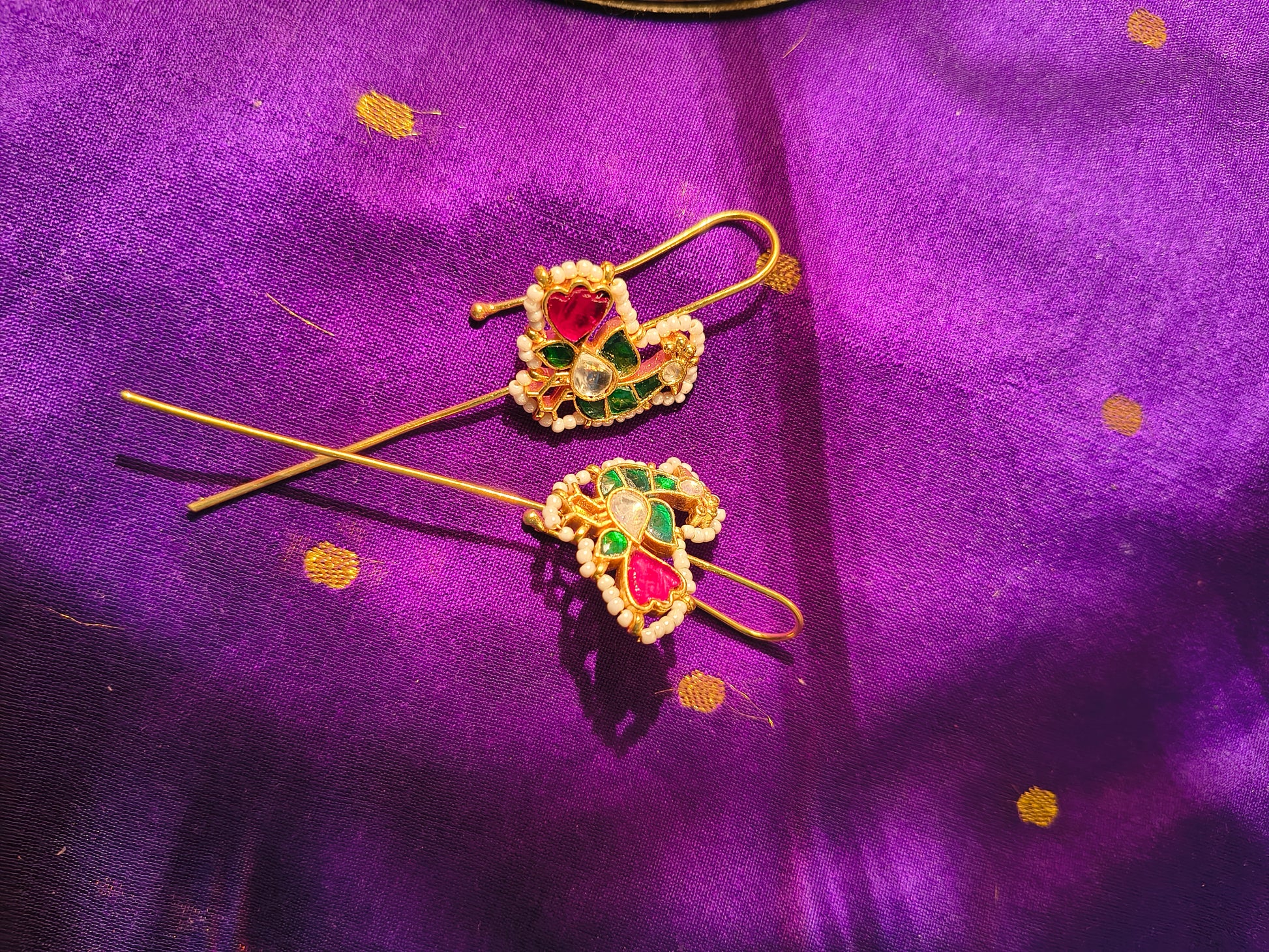 Elevate your ethnic ensemble with this striking Peacock Motif Temple Ear Pin, meticulously crafted to echo timeless elegance. Featuring a delicate fusion of green and magenta enamel, this piece is inspired by traditional temple art with a contemporary twist. At the center, the majestic peacock design—symbolizing grace and beauty—is accentuated with kundan stones and encircled by micro pearl beadwork for added grandeur.