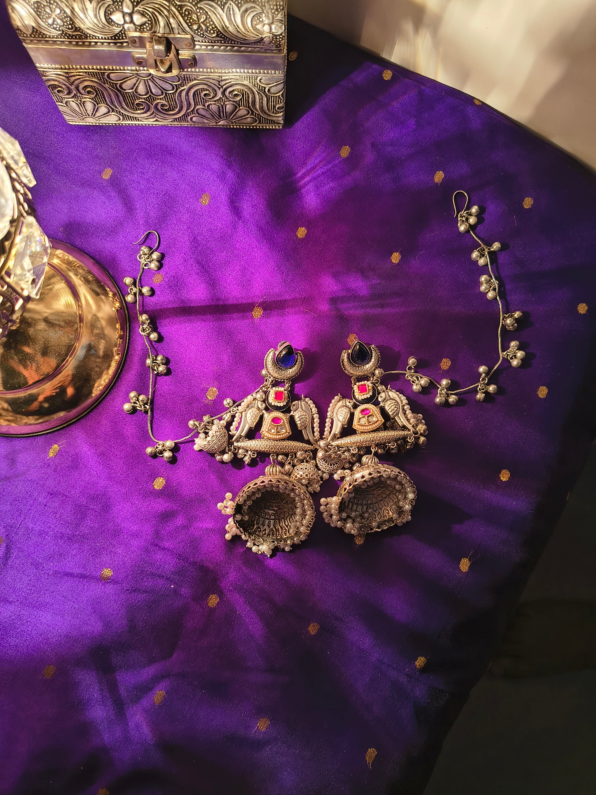 Type: Dangler jhumka with attached hair chain (kann chain)