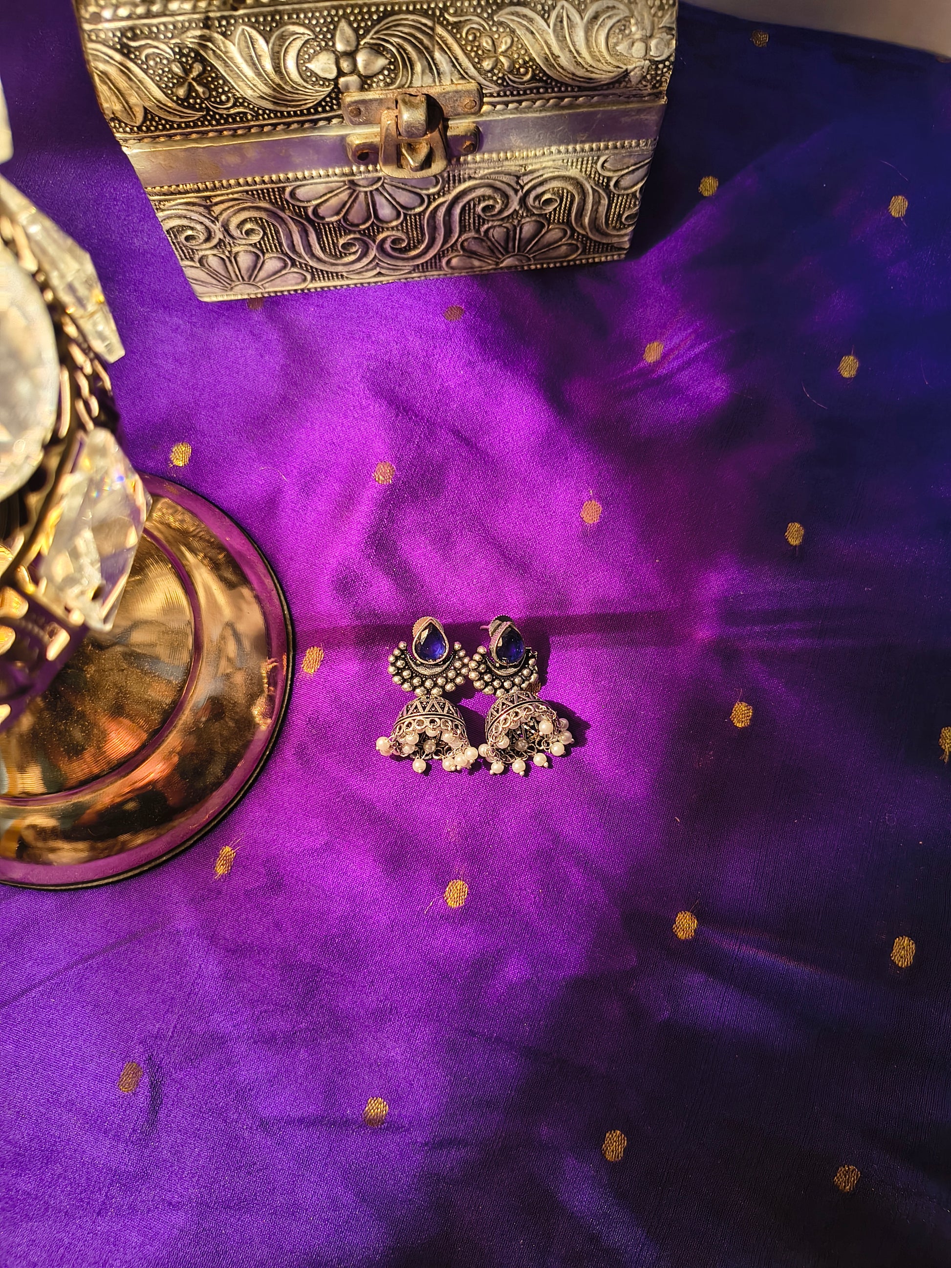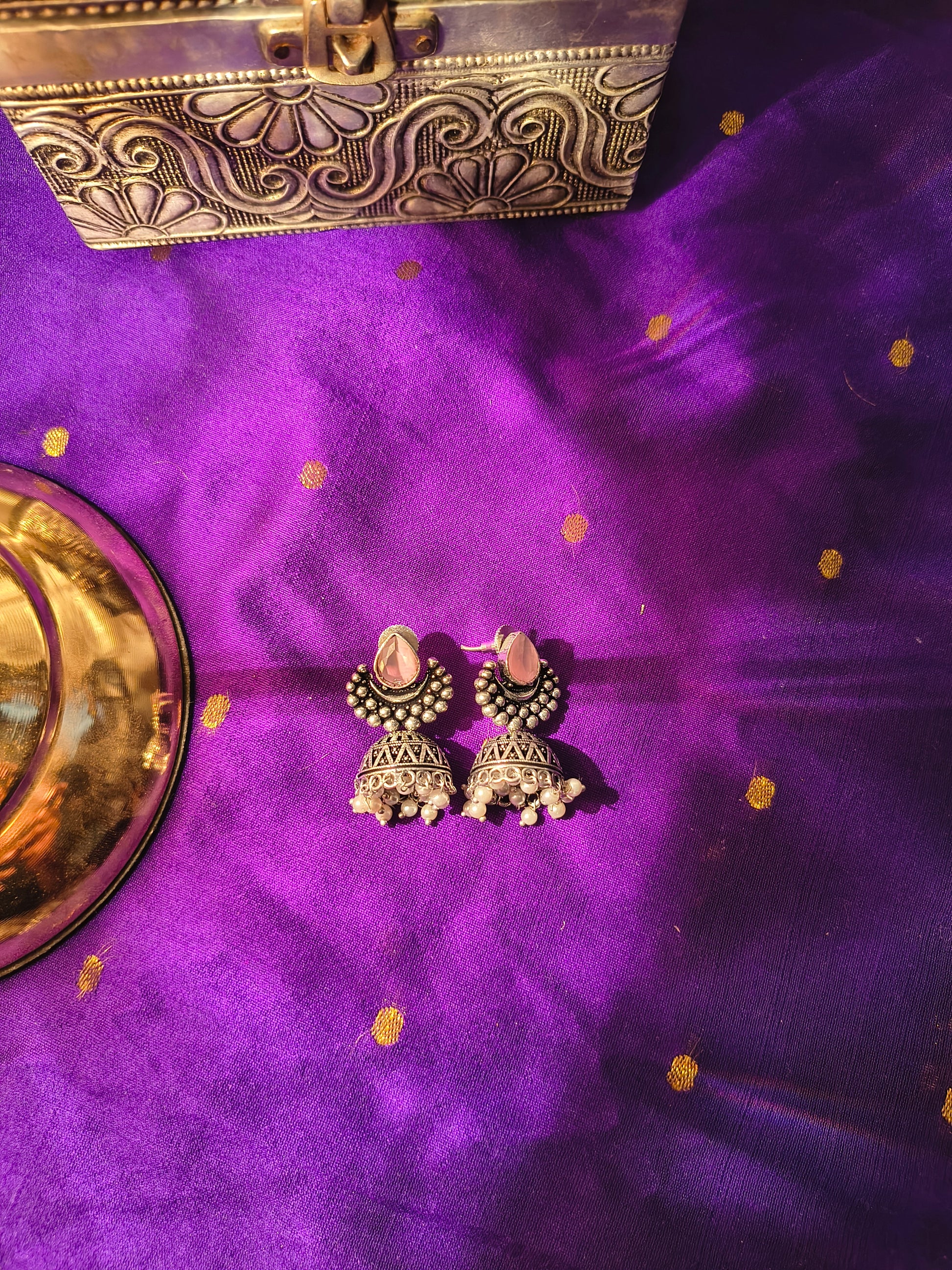 Add a timeless elegance to your ethnic ensemble with our beautifully handcrafted Antique Teardrop Stone Jhumka Earrings. Featuring a stunning teardrop stone stud paired with intricately detailed dome-shaped jhumkas, these earrings are adorned with antique silver finish and delicate pearl danglings for a perfect traditional flair.