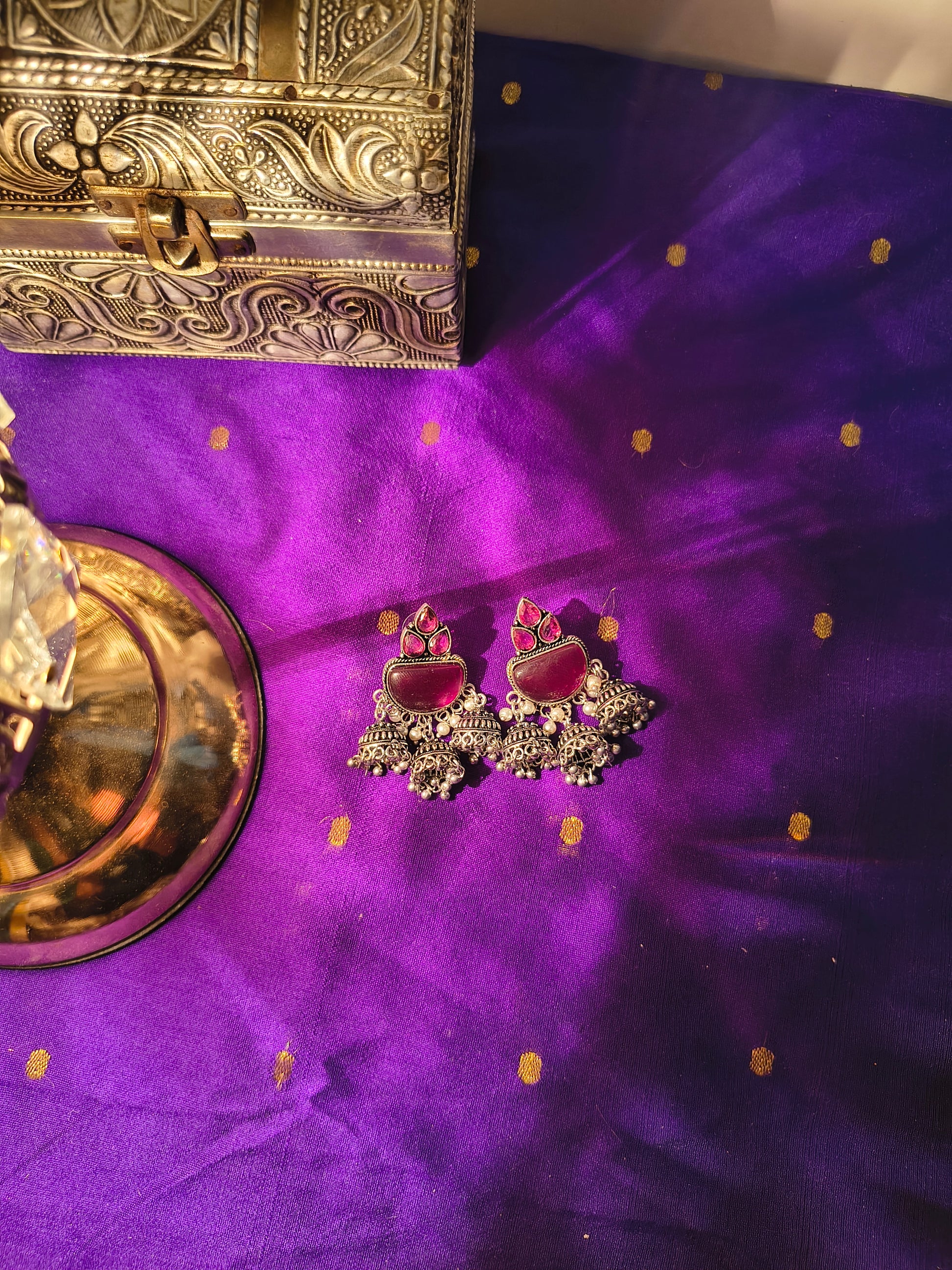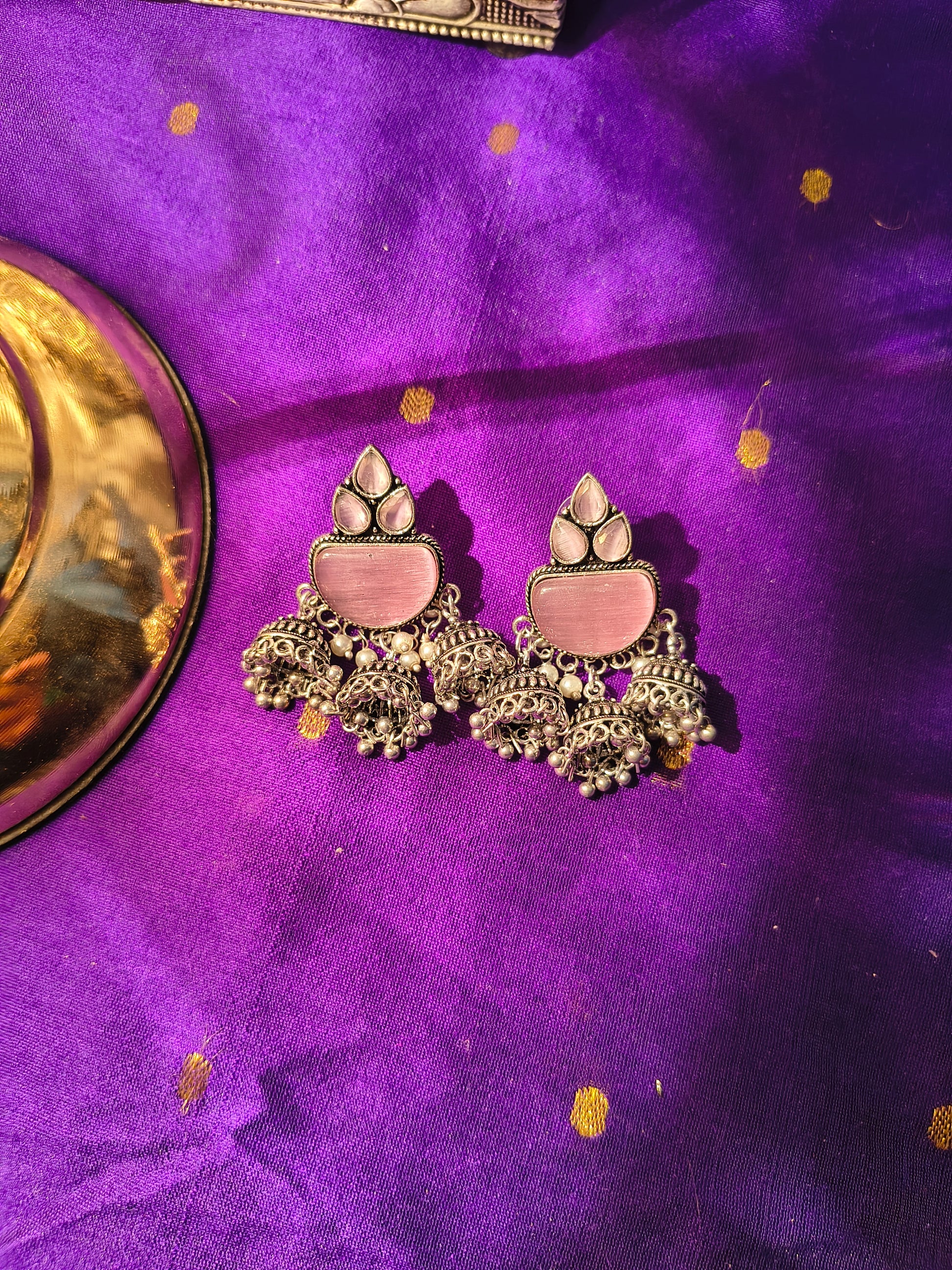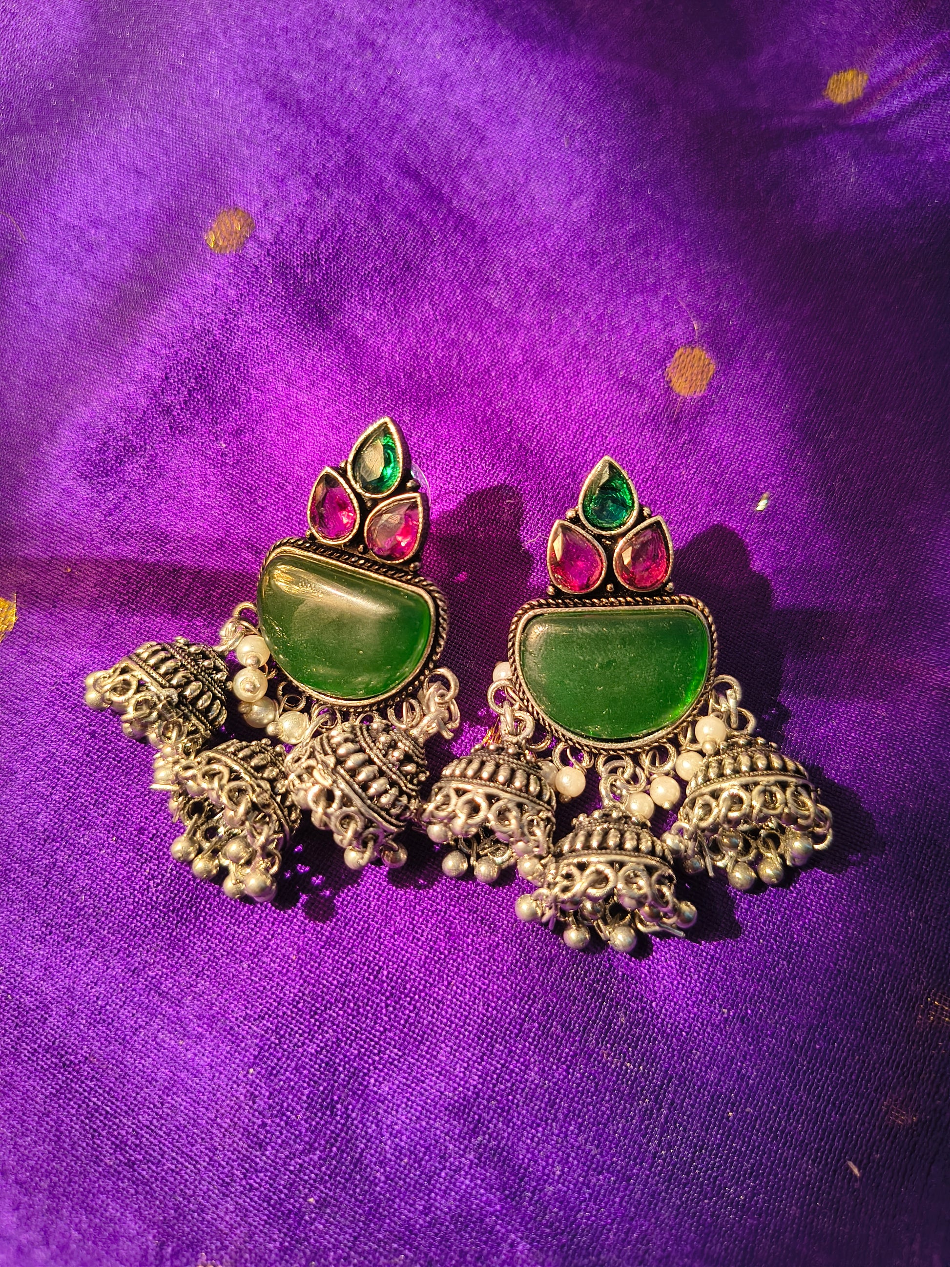 Elevate your ethnic charm with our Riwaayat Triple Jhumka Earrings, a graceful fusion of temple-inspired design and modern vibrance. Handcrafted with intricate oxidized silver detailing and finished with cascading triple jhumka drops, each pair tells a story of timeless beauty.