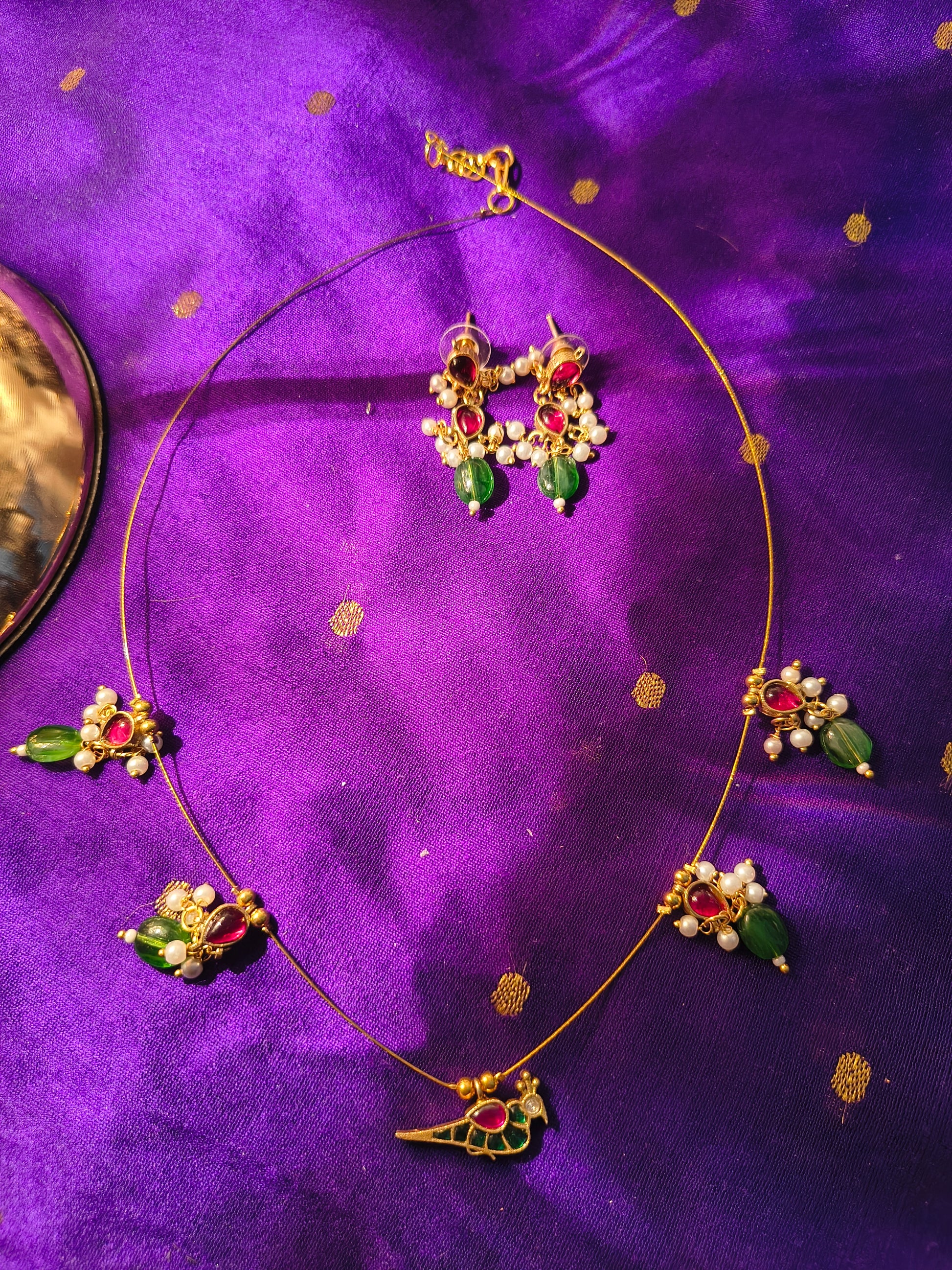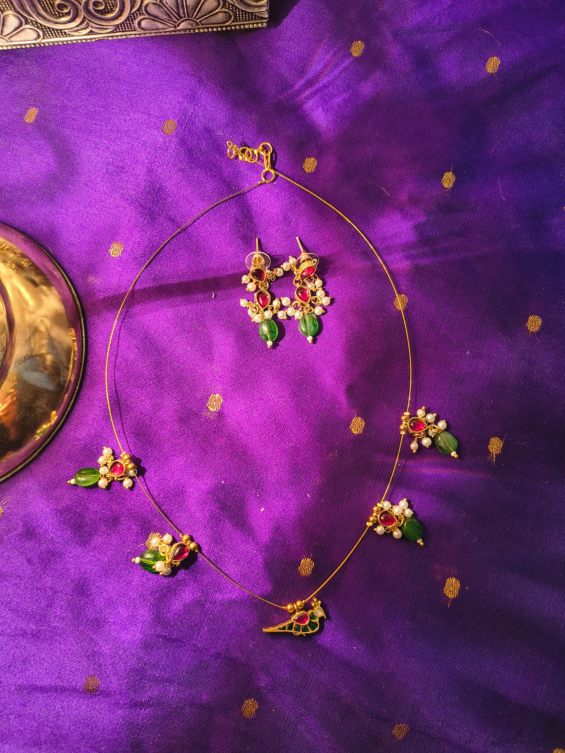 Bring the charm of nature and heritage together with this exquisite Aaranya Parrot Bloom Necklace and Earring Set, inspired by traditional South Indian temple aesthetics. The intricately crafted parrot design symbolizes beauty, grace, and auspiciousness, making this set a standout accessory for any ethnic celebration.
