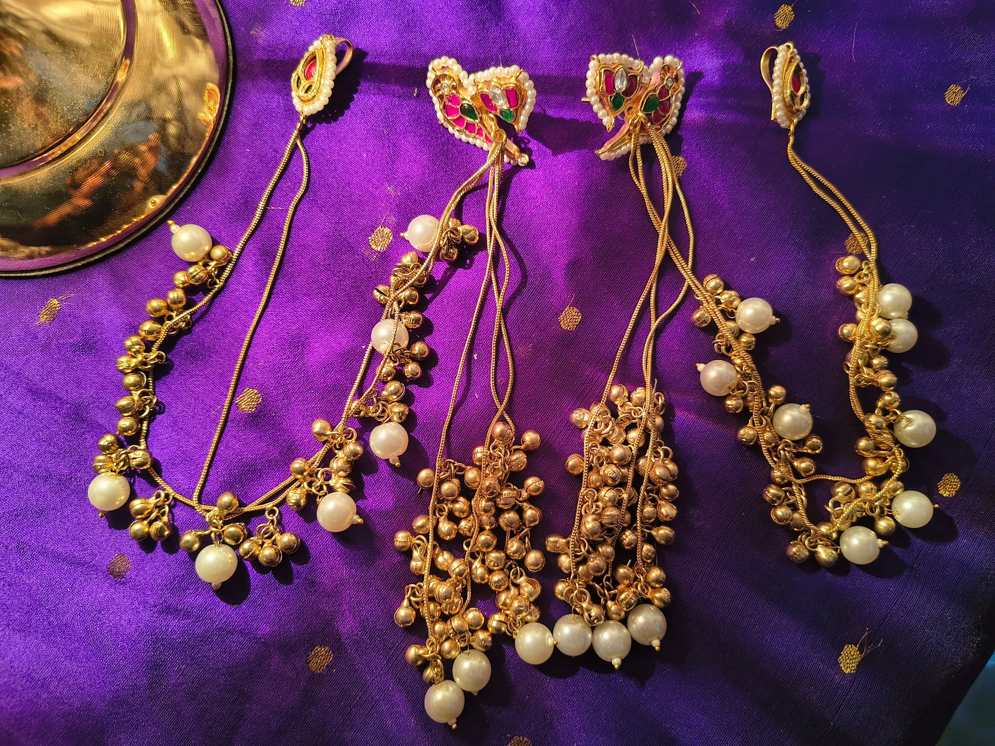 dd an exquisite touch to your festive or bridal ensemble with our Rasika Traditional Kemp Jhumki Mattal Set, a stunning blend of heritage craftsmanship and ethnic elegance. This set includes four variants of ear chains (Mattals/Kaan Chains) designed to enhance and support heavy jhumkas or earrings during long events.