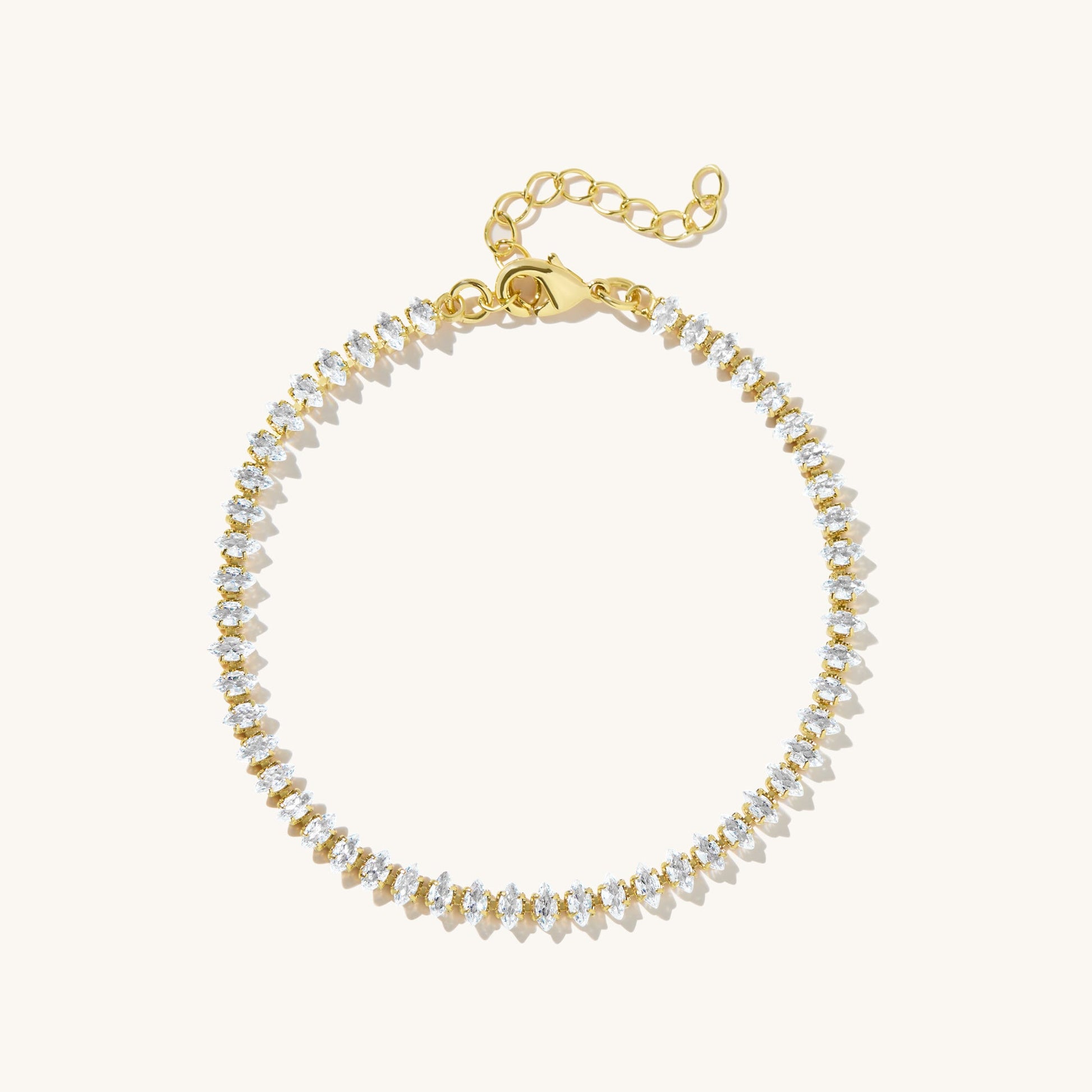Elevate your style with this Marquise-Cut Stone Tennis Bracelet, a dazzling piece that adds instant glam to any outfit. Featuring high-shine marquise-cut cubic zirconia stones set in a sleek gold-tone setting, this bracelet captures the perfect balance of elegance and sparkle. Lightweight yet luxurious, it’s ideal for parties, weddings, or adding shine to your everyday look.