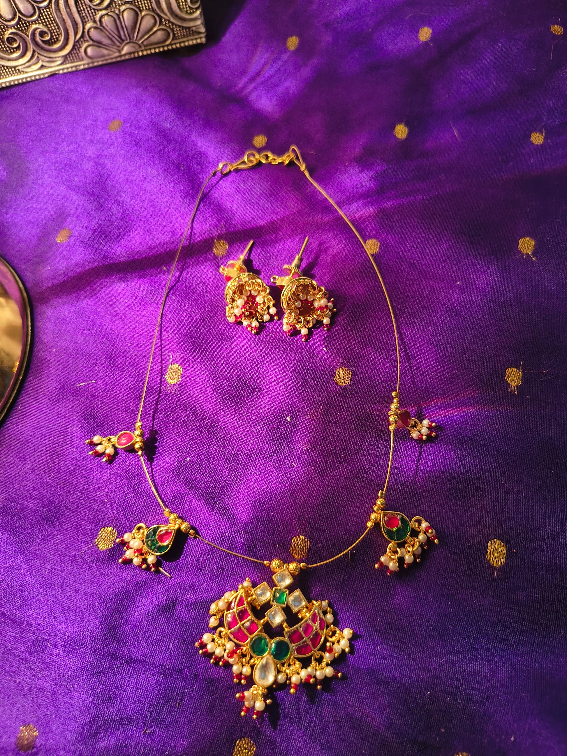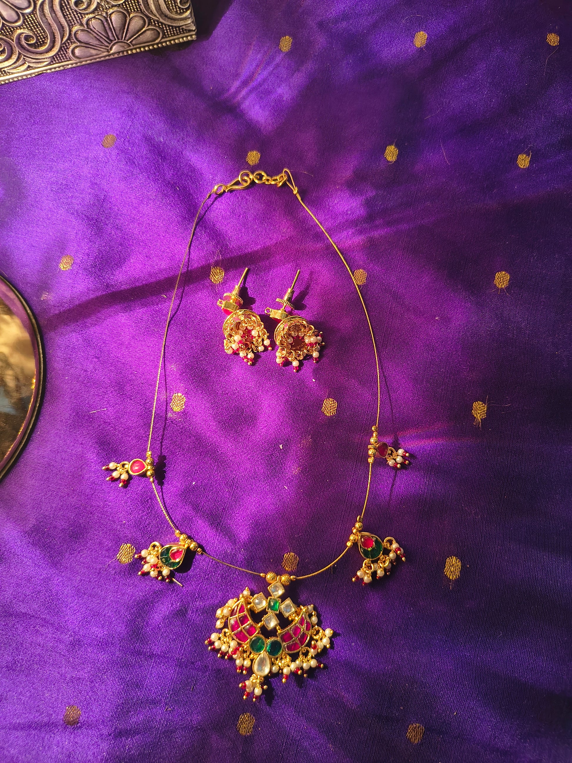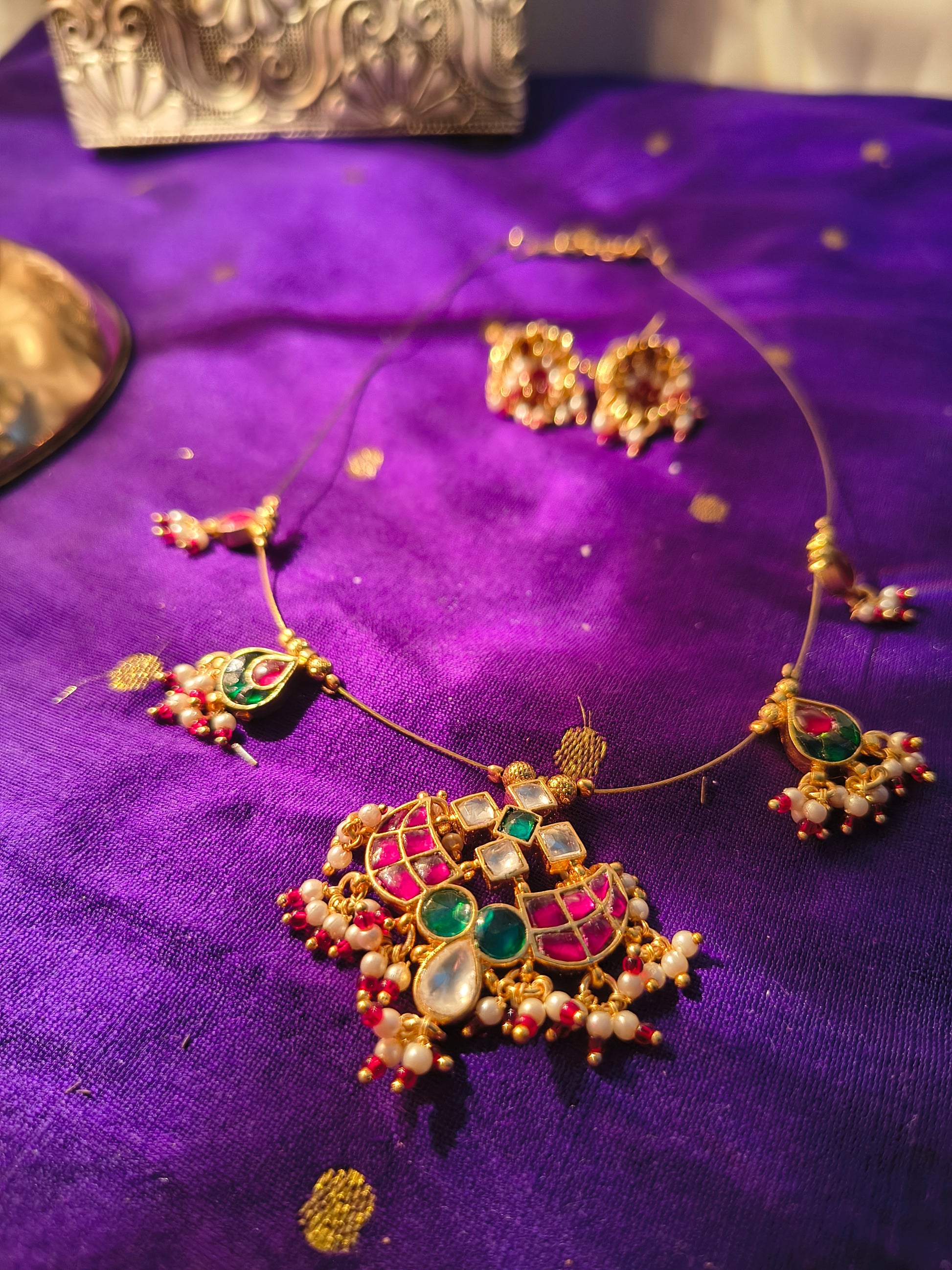 - Design: The necklace showcases a majestic pendant adorned with rich green and ruby-red stones, surrounded by delicate kundan work and clusters of pearl drops. Each motif is carefully crafted, reflecting the finesse of temple jewelry with a regal twist.