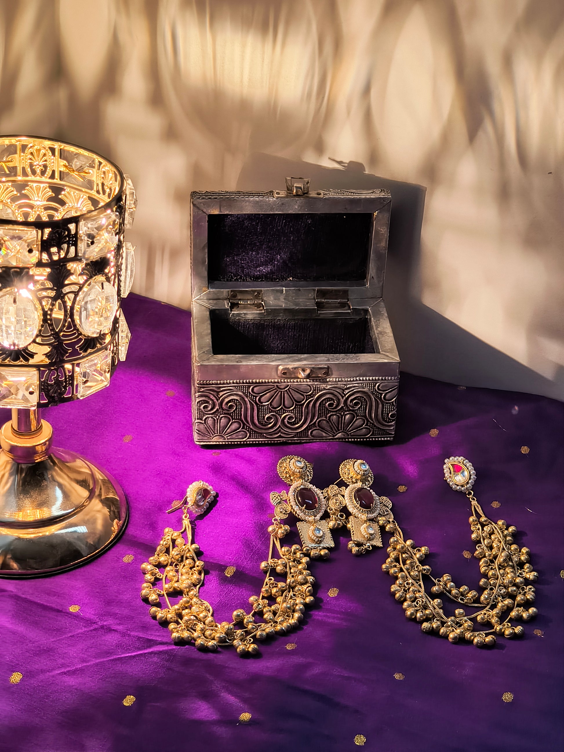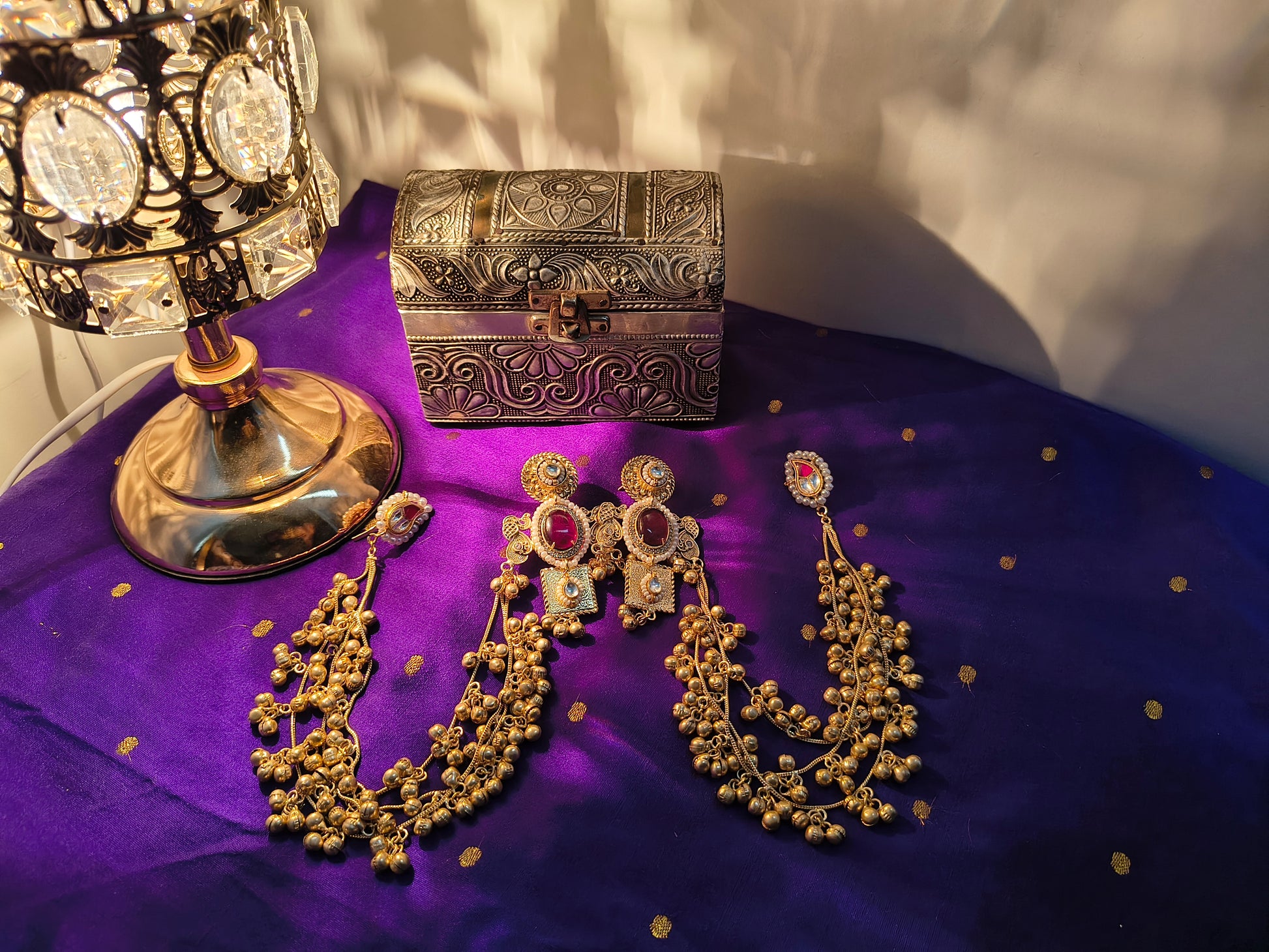 Turn heads with these statement heritage earrings crafted in antique gold tones, a perfect fusion of grandeur and tradition. These dual-drop earrings are embellished with shimmering kundan stones and adorned with cascading ghungroo (bells) chains, adding both visual and auditory elegance to your every move. The intricate motifs and handcrafted detailing reflect timeless artistry, making them an essential addition to your festive and bridal collection.