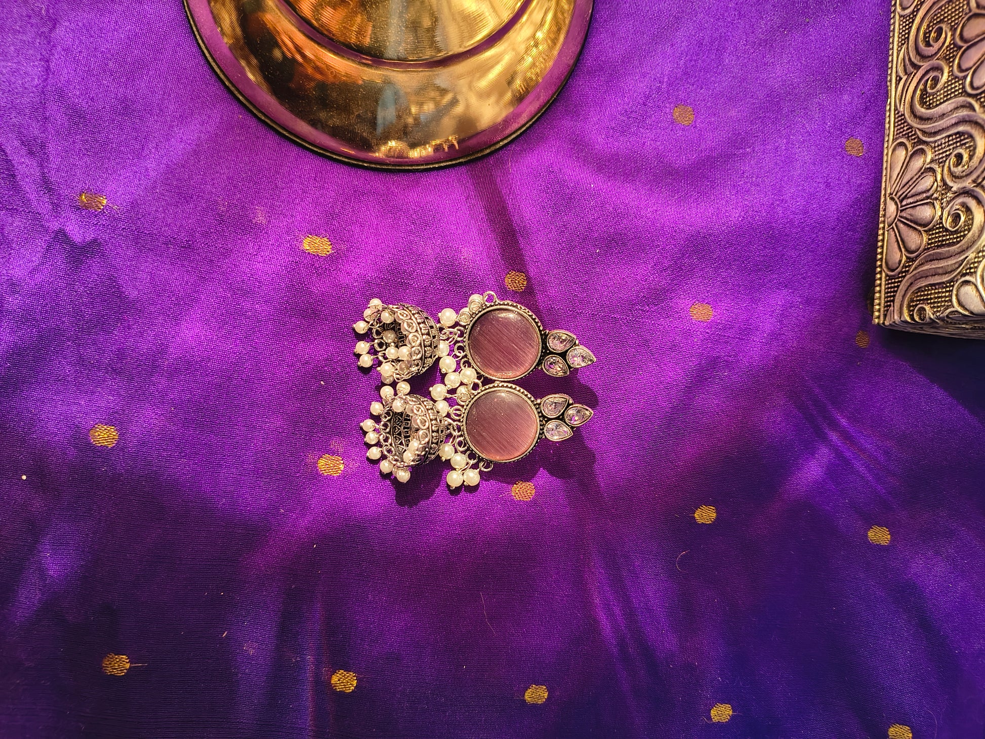 Add a timeless touch to your look with our Vintage Pearl Dome Dangler Earrings, a stunning blend of antique charm and modern elegance. These oxidized silver-tone earrings feature a bold, round stone centerpiece available in beautiful shades of mauve pink, sea green, and emerald green. The top part is accented with sparkling teardrop glass stones in complementary hues, adding a touch of colorful vibrance to each piece.